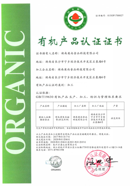 英尚以产品质量安全第一为己任,建立10万级GMP车间的自有辅食现代化工厂,并且已经通过了ISO9001质量体系认证、HACCP认证,有机生产认证。