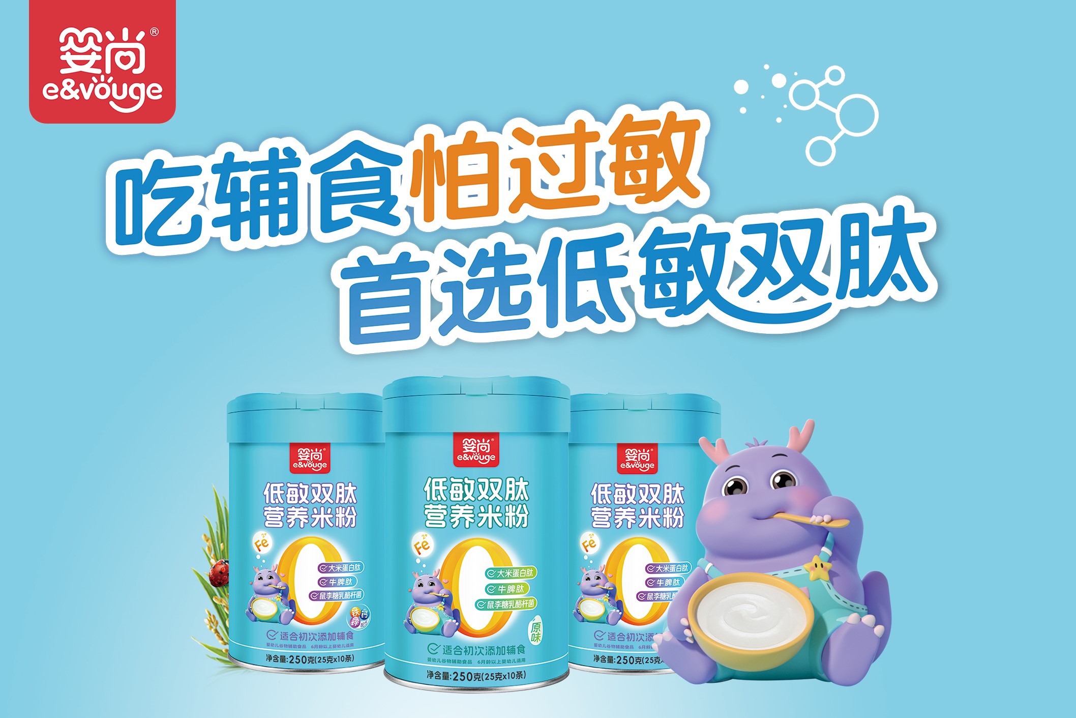 作为敏宝的妈妈第一次添加辅食的时候总是会充满焦虑,担心辅食成为食物过敏源,但是家长们都知道7-12月龄婴儿97%的铁需要来自辅食,铁缺乏和缺铁性贫血可损害婴幼儿认知发育和免疫功能。添加富含铁的辅食是保证婴幼儿铁需要的主要措施,因此婴尚从关爱敏宝健康出发,推出了低敏双肽米粉,专为敏宝研制。