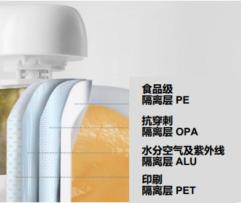 婴尚果泥采用四层锁鲜包装(食品级隔离层 PE、抗穿刺隔离层 OPA、水分空气及紫外线隔离层ALU以及印刷隔离层 PET),杜绝了氧气和细菌,同时采用巴氏杀菌工艺,不添加防腐剂也能保鲜,最大程度保留了原材料的营养。